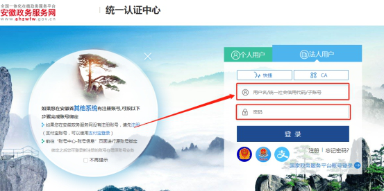 2. 輸入安徽政務(wù)服務(wù)網(wǎng)統(tǒng)一認(rèn)證賬號(hào)密碼