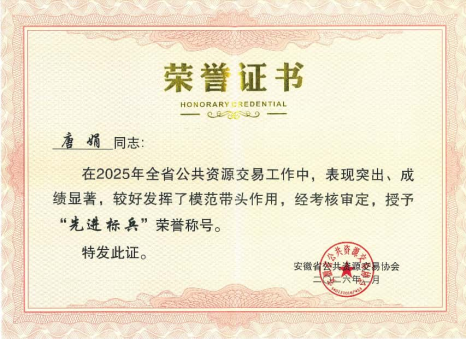 會上,對2025年度全省公共資源交易領(lǐng)域先進(jìn)典型進(jìn)行了表彰。皖宜公司斬獲“2025 年創(chuàng)新發(fā)展優(yōu)質(zhì)服務(wù)模范單位”榮譽(yù)稱號;公司職工唐娟被授予“2025 年全省公共資源交易領(lǐng)域先進(jìn)標(biāo)兵”榮譽(yù)稱號。